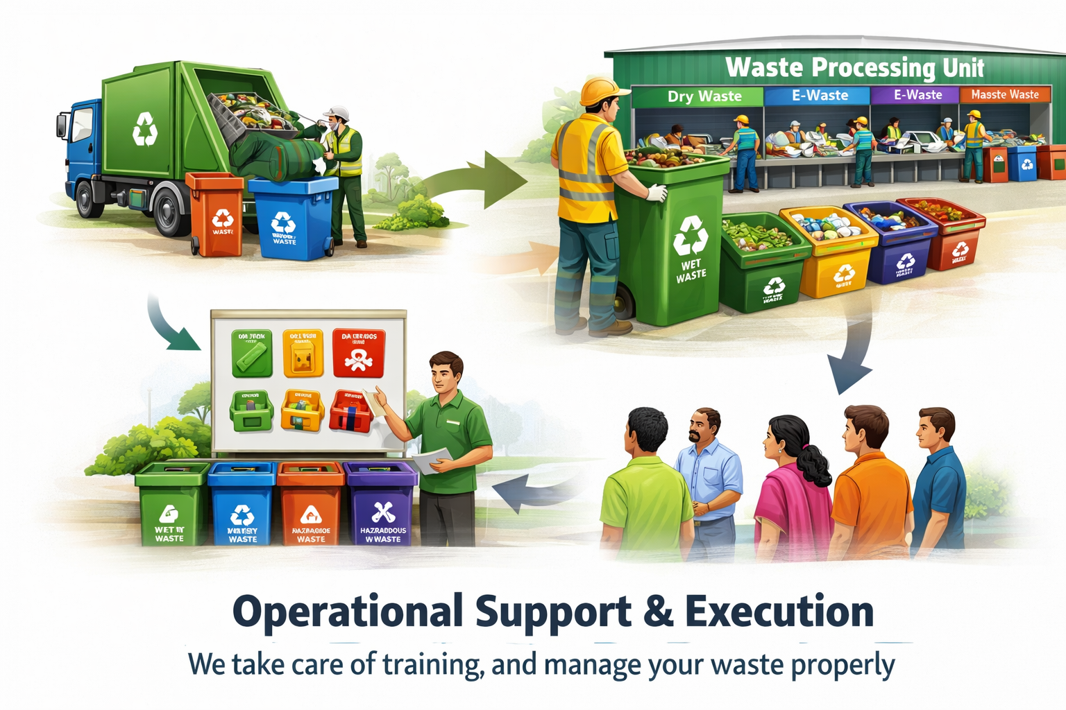 Waste management is an ongoing process, and we support you beyond just setup. We assist in daily operations, system monitoring, and continuous improvements to ensure everything runs smoothly. We also conduct awareness sessions, workshops, and basic training to help individuals and communities understand proper waste segregation practices. Our goal is to make waste management simple, effective, and a part of everyday life.